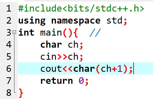 #include<bits/stdc++.h> using namespace std; int main(){ // char c; cin>>c; cout<<char(c+1); return 0; }