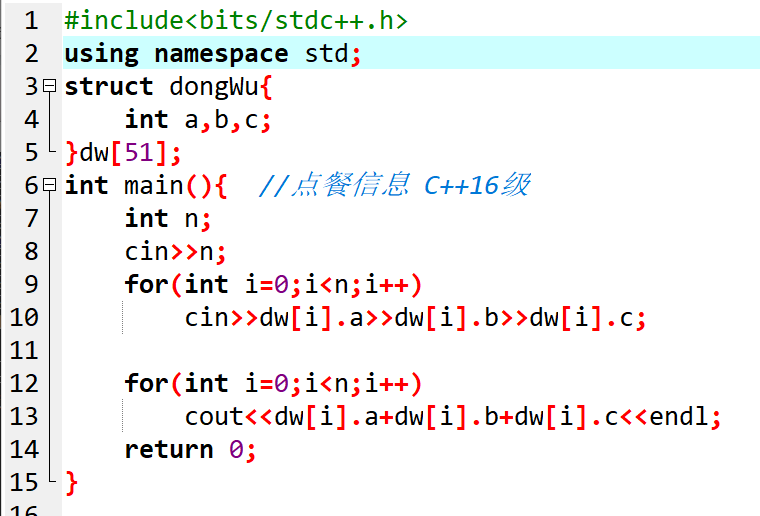 #include<bits/stdc++.h> using namespace std; int main(){ // int n,a,b,c; cin>>n; while(n--){ cin>>a>>b>>c; cout<<a+b+c<<endl; } return 0; }