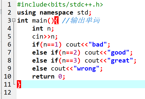 #include<bits/stdc++.h> using namespace std; int main(){ //输出单词 int n; cin>>n; if(n==1) cout<<"bad"; else if(n==2) cout<<"good"; else if(n==3) cout<<"great"; else cout<<"wrong"; return 0; }