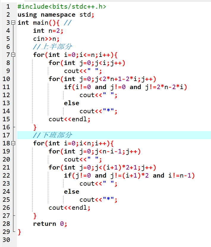 #include<bits/stdc++.h> using namespace std; int main(){ int n=2; cin>>n; n=n*2+1; for(int i=0;i<n;i++){ for(int j=0;j<n/2-abs(i-n/2);j++) cout<<" "; for(int j=0;j<=abs(i-n/2)*2;j++) if(i==0 or i==n-1) cout<<"*"; else if((j==0 or j==abs(i-n/2)*2)) cout<<"*"; else cout<<" "; cout<<endl; } return 0; }