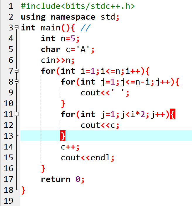 #include<bits/stdc++.h> using namespace std; int main(){ //C++9级_画等腰字符三角形 int n=9; char letter='A'; cin>>n; for(int i=0;i<n;i++){ //先打印一个由空格组成的倒三角形 for(int j=0;j<n-i-1;j++) cout<<" "; //再打印一个由字符letter组成的等腰三角形 for(int j=0;j<=i*2;j++) //实现字符递增:ABBCCC cout<<char(letter+i); cout<<endl; } return 0; }